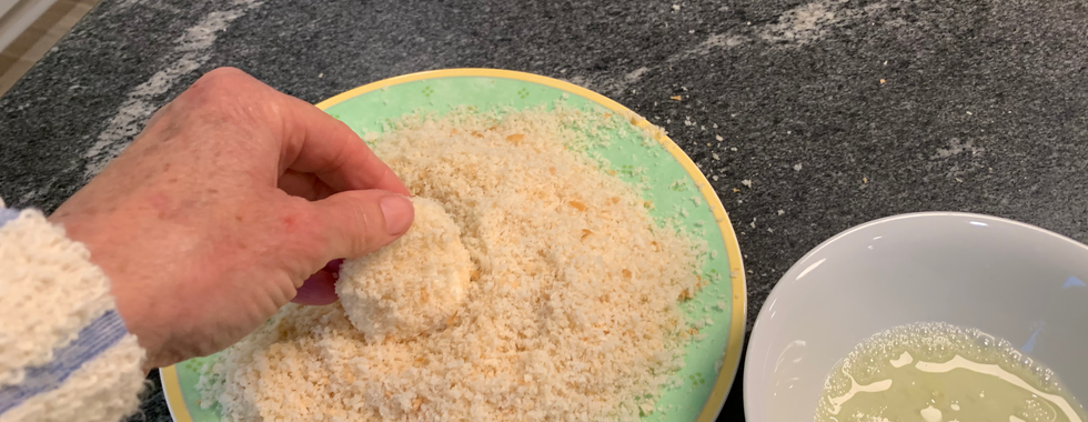 Dip each round into the beaten egg whites, then the bread crumbs, making sure to coat the cheese thoroughly.
